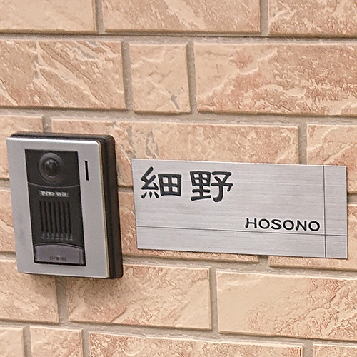ベージュ系タイルの外壁に、「ステンレス シンプルライン表札 200×80mm」がすっきりとマッチして、とてもきれいに設置いただいていますね。
