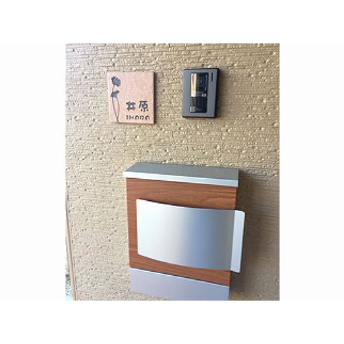 予想通り茶色のポストと茶色の壁にとても馴染んでいると思います。壁が多少凸凹しているので接着剤で取り付けられるか心配でしたが、問題なく取り付けできました。