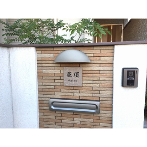 ベージュ系のタイル外壁に同系色「表札 Antico(アンティコ)」が自然に馴染んでいます。