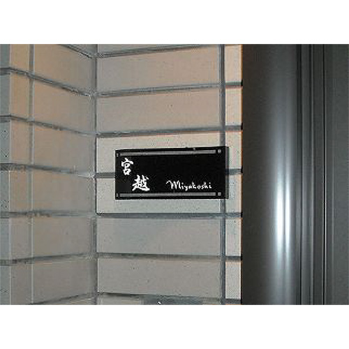 オリジナル書体の文字と、ドラゴン体のローマ字の組み合わせのウェーブストーンEW-3の黒ミカゲ表札が、なんともいえずかっこいい仕上がりになっています。壁面にマッチして本当に素敵ですね!!