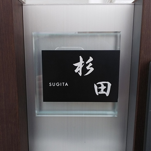 漢字には威厳と勢いのある 平成行書体 を、ローマ字には可愛さを残しつつもスッキリとした印象の フーツラ体 をお選びいただいたことで、和に寄りすぎることなく、非常にバランスの良い表札に仕上がっていて素敵です。