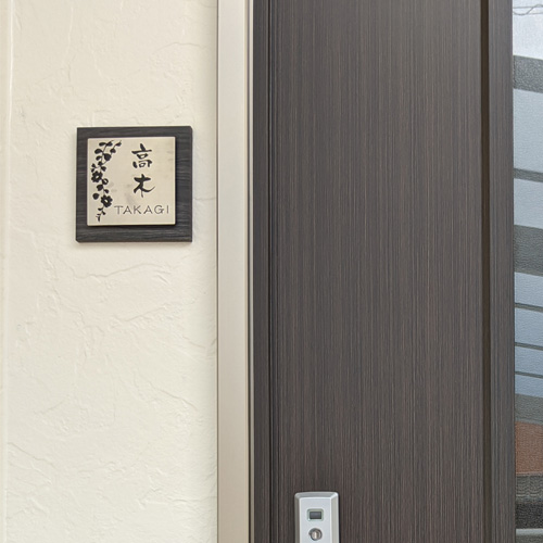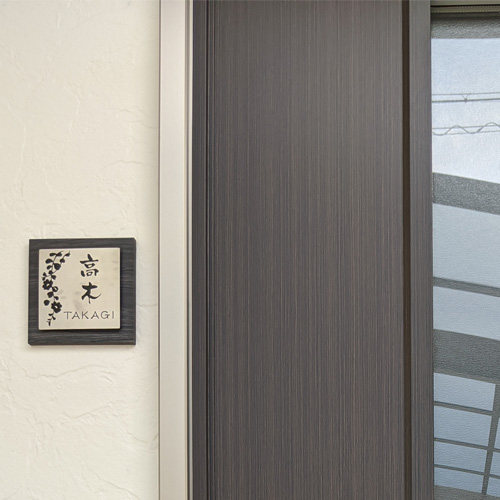 ドアの色がダークブラウンの木目調なので、表札も合うのがとてもマッチしています。
