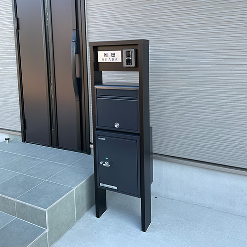 ステンレス素材のベースに文字色黒をお選びいただきました。取り付けた門柱との雰囲気ともマッチして素敵ですね。