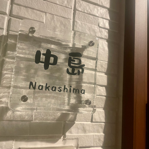壁面が透かし見えるクリアなガラス表札に黒の文字色が映えていて、壁面の雰囲気ともマッチしてとても素敵ですね。