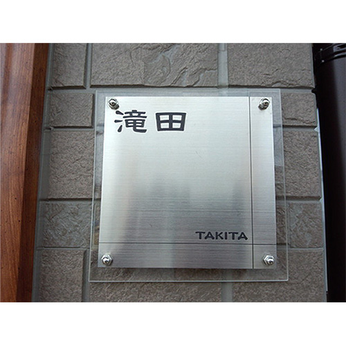 ステンレスのシンプル表札を直接付けるつもりで購入しましたが、思っていたより壁が凸凹していたため、主人が工夫してアクリル板やねじなどをホームセンターで購入して立体の表札を作ってくれました。とっても気に入ってます。