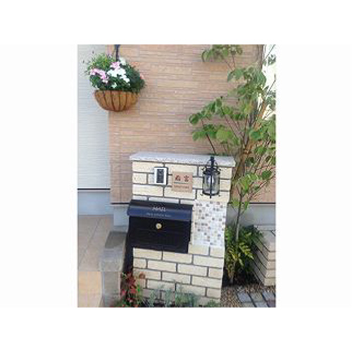 門柱の煉瓦の色やランタン、メールボックスの小物が南欧の雰囲気を醸し出す素敵なエントランスにタイル表札のジェラートを飾っていただきありがとうございます。