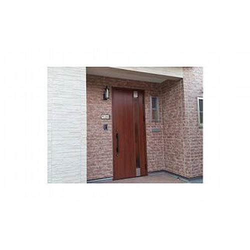 格調高い雰囲気のあるエントランスにマルコを飾っていただきました。ランプとマルコの金属フレームがマッチし、レンガ調・タイル状の壁面の風合いとタイル表札が見事に調和されていて素敵ですね。