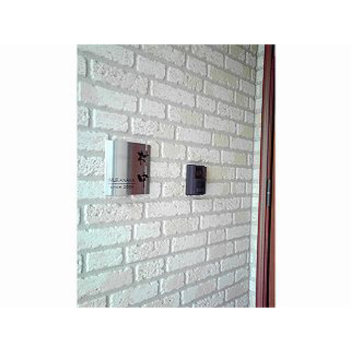 素敵な白いタイル調外壁に、スタイリッシュでモダンな「表札MPR-S-92 ドライエッチングシリーズ ステンレス」が綺麗に馴染んでいて、ホテルや博物館のエントランスを思わせるような素敵な仕上がりですね。