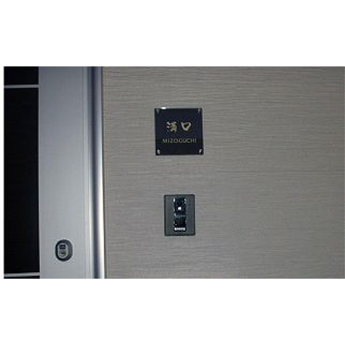 ウッド調の表札Timber(ティンバー)がドアの素材と統一感を出しつつ、全体的にシックにまとめられた玄関に見事に馴染んでいて、センス良くまとめておられます。