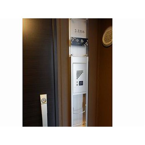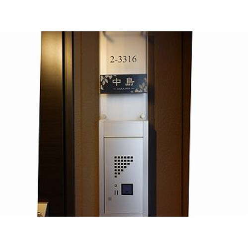 シックなブラウン基調の玄関先に、Flits(フィッツ)の色彩とデザイン、視認性の高い隷書体と部屋番号の書体が見事に調和していて、とても一体感がありますね。