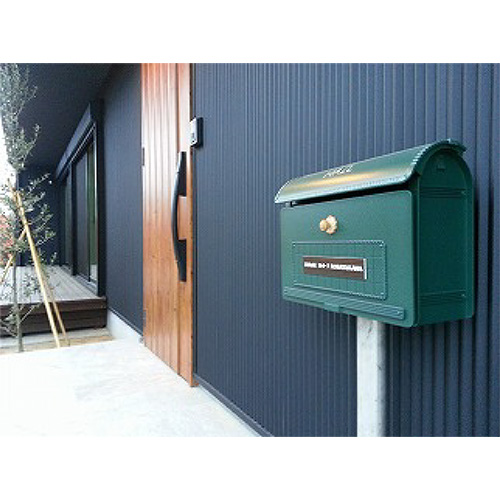 黒い壁に緑のポスト、どんな表札にしようか迷っていたところハンコヤドットコムさんの商品を見て気に入り即購入、柄に迷いましたがウッド柄に決めとても満足しています。