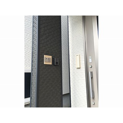 シックなブラックの壁面に、薄いカラーで木目デザインのムウル表札が、くっきりと映えていますね。