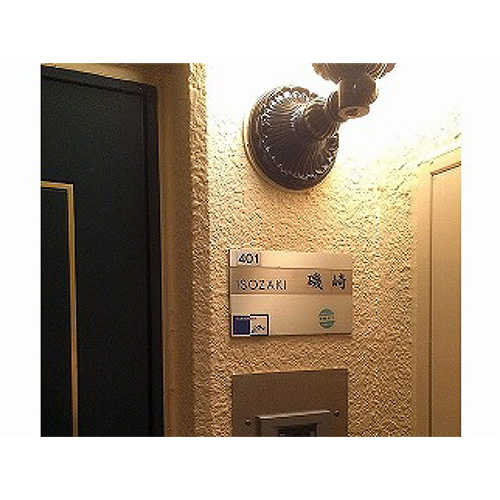 白熱灯の温かみのある光と、クールな印象の「表札 ドライエッチング」がバランス良くとてもマッチして素敵ですね。今回ご選択頂いております「楷書体」と「フーツラ体」といった書体が、落ち着いた存在感を感じさせてくれるお仕上がりとなっています。