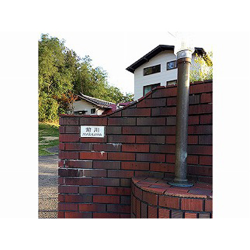 赤いレンガ調の門柱に、落ち着きのある「天然石デザイン表札 ミカゲ石L」が素敵ですね!